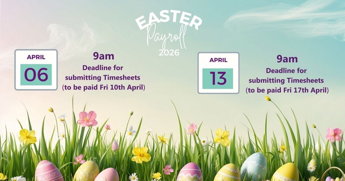The good news is that payroll and timesheet submission dates remain unchanged over the Easter period. As long as your timesheets are submitted on time, payment will be processed as normal.